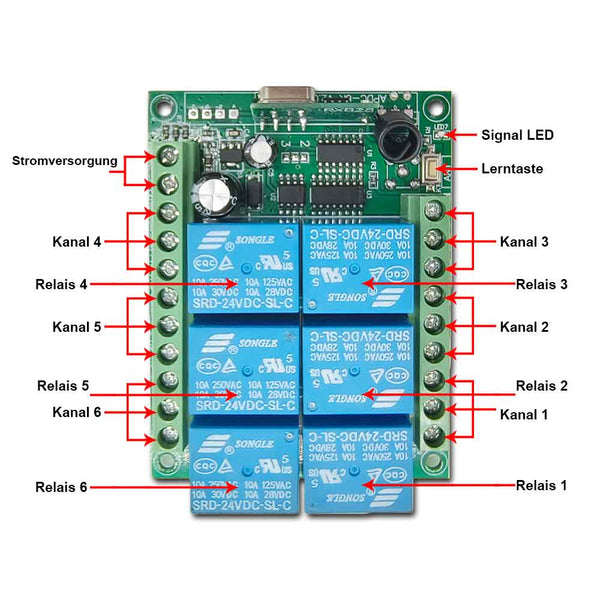 Drücken Sie die Taste 6 am Sender: Das Relais 6 im Empfänger wird aktiviert und die angeschlossene Lampe 6 wird eingeschaltet.
