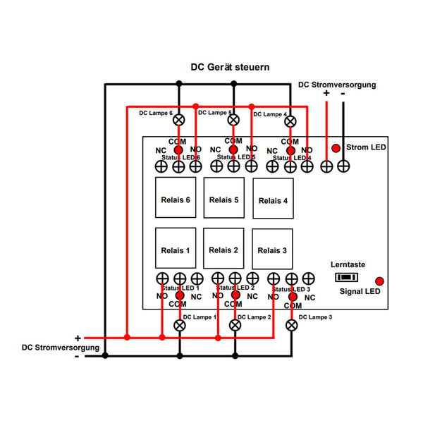 Drücken Sie die Taste 6 am Sender: Das Relais 6 im Empfänger wird aktiviert und die angeschlossene Lampe 6 wird eingeschaltet; Die anderen 5 Relais wird deaktiviert und die anderen 5 angeschlossene Lampen wird ausgeschaltet.
