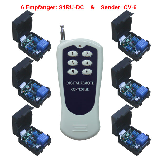 Sechs Empfänger S1RU-DC und der Sender CV-6 bilden ein Empfänger Sender System. Es kann Lichter, Motoren, Ventilatoren, elektronischen bedienten Türen / Schlösser / Fenster / Markisen / Autos oder andere Anlagen mit AC 110V~240V oder DC 0~28V steuern.