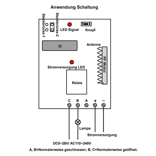 Relaisausgang: Dieser Empfänger ist der trockene Relaisausgang, es können zur Steuerung DC und AC Geräte verwendet werden. Die Ausgangsklemmen sind NO / NC (normalerweise geöffnet / normalerweise geschlossen) und dienen als Schalter. Es bedeutet, dass Sie auch eine separate Stromversorgung an Geräte anschließen sollen.