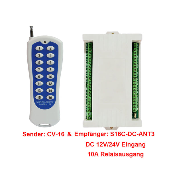 Dieser Empfänger S16C-DC-ANT3 und der Sender CV-16 bilden ein Empfänger Sender System. Dieses System kann in der Industrie-Automatisierung, Landwirtschaft-Automation und Heim-Automation, wie Fabrik, haus, bauernhof, weide, Fahrzeugen, Schiffen, Offshore-Betrieb, Luftfahrzeug, Feld Anruf, usw. Es kann drahtlose fernbedienung verschiedene ausrüstungen an Land, Wasser und Luft, wie Funklichtschalter, Sirenen, Schlösser, Motoren, Ventilatoren, Winden, Jalousien, Elektrozylinder, Türen, Fenster, Elektromagnetventile, Signalisierung, Geschäftsschilder usw.