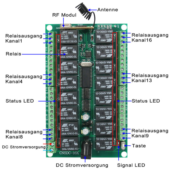 Hinweis 1: Wenn Sie die Sender CV-16 verwenden, um mit diesem Empfänger zu arbeiten, da der Sender CV-16 insgesamt 16 Tasten hat, so dass jede Taste einen Kanal dieses Empfängers auslöst.