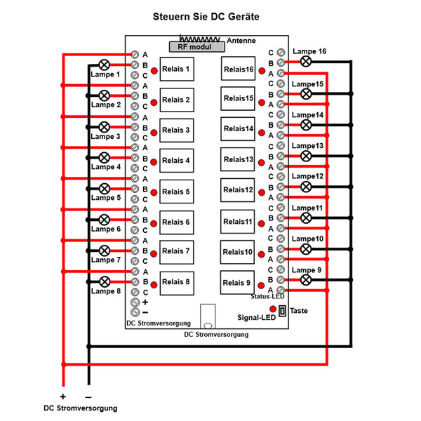 Drücken Sie die Taste 16: Das Relais 16 ist aktiviert (verbinden Sie die Klemmen A und B, trennen Sie die Klemmen B und C), und die Lampe 16 wird eingeschaltet. Weitere 15 Relais sind deaktiviert (trennen Sie die Klemmen A und B, verbinden Sie die Klemmen B und C), und weitere 15 Lampen sind ausgeschaltet.