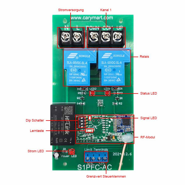 Dieser Empfänger S1PFCW-AC-ANT3 und der Sender CC-3-2 bilden ein Empfänger Sender System. Es kann in Rollladen, Rolljalousien/Türen, Leinwände, Markisen, Pumpen, Winden, Förderanlagen oder anderen Geräten und Mechanik mit AC motoren verwendet werden.